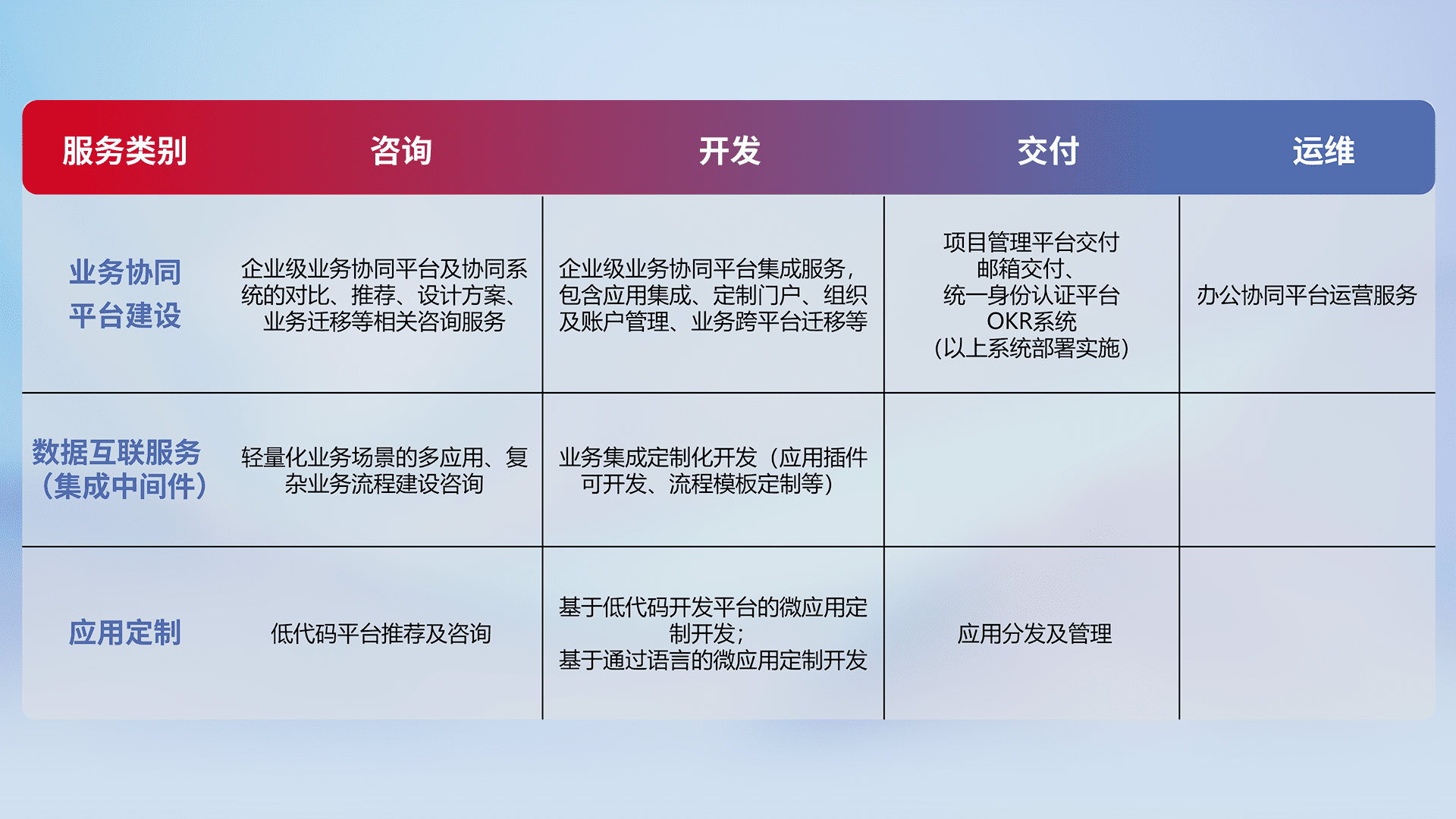 针对钉钉、、、企微、、、IDaas等平台级产品提供产品的规划、、、方案、、交付、、、、定制化开发等服务,,实现如统一协同办公、、智能客户服务、、、、混合会议管理、、、、智能数据查询、、等业务场景,,,实现数字化转型。。。